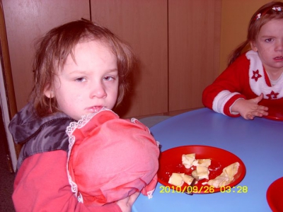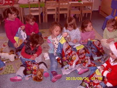 A wyglądało to u nas tak: Najpierw mogliśmy sie ponajadać naleśnikami. Pysznymi. Albo z czekoladą, albo z serkiem. Niektóre dzieci pierwszy raz jadły takie naleśniki. Byli tacy, którzy próbowali jeść widelcem, inni- rączkami. Ale szło nam dobrze. Gdy już się najedliśmy, to Karolinka została oficjalnie mianowana pomocnikiem Świętego Mikołaja. Przebrano ją w specjalną sukienkę i mikołajową czapkę, a potem pomagała rozdawać worki z prezentami. Jak na to sprawdzanie, czy jesteśmy grzeczni, to Mikołaj dużo nam dał prezentów. Chyba na zachętę. Ja uwielbiam dostawać szczotki do zębów z dinozaurami, albo z księżniczkami. I Mikołaj to wie. Ciekawe, czy wie o moich pozostałych marzeniach...???