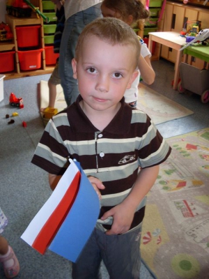 Chciałam opowiedzieć o tym, że my, w przedszkolu to nie tylko się bawimy i śpiewamy- jak te krasnoludki, co gdy są młode, to żadnych ważnych spraw nie miewają, tylko się bawią i śpiewają- ale też się uczymy. Na przykład tego, że mamy dwie flagi. Jedną, która się nazywa "flaga Polski" i jest biało- czerwona i drugą- "flagę Unii Europejskiej". I ta jest już bardziej skomplikowana, bo żeby ją zrobić, trzeba się natrudzić z naklejaniem malutkich, żółtych gwiazdek. A mamy flagi dwie, bo mieszkamy w Polsce, a Polska jest w Unii Europejskiej. To wcale nie jest takie łatwe.