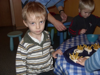 Podczas ostatniej wycieczki na koniki lepiliśmy z takiej specjalnej plasteliny, która się nazywa "masa solna"- jeże. Bardzo nam się ta zabawa spodobała i udało nam się namówić panie w przedszkolu, żeby polepić coś jeszcze raz. A że mamy już wielkie doświadczenie w lepieniu jeży, to robiliśmy je znowu. Tylko kolce były inne- kluskowe. Ulepiliśmy też gruszki i jabłka z listkami. Śliczne.