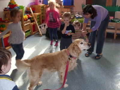 Ja jestem tu nowy. Dopiero poznaje, o co w tym przedszkolu w ogóle chodzi. Na razie wiem, że w każdą środę, czyli w środku tygodnia przychodzą do nas psy. Podobno od bardzo, bardzo dawna. Dzieci się wcale nie dziwią. A dla mnie to jest trochę trudne. Chociaż pieski są dwa i żadne dziecko się ich nie boi. Podglądałem, że wszyscy je głaszczą, dotykają, czeszą. Zwierzęta są spokojne, jakby chciało im się spać. Może mi się kedyś uda do nich podejść...
