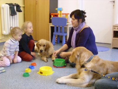 Dziś, jak w każdy poniedziałek mieliśmy zajęcia z pieskami. Przyszły do nas dwa znajome, duże i puszyste pieski – Ami i Zako.